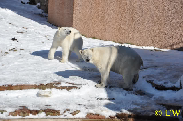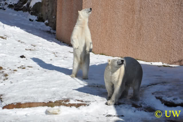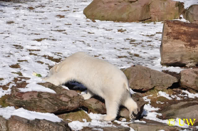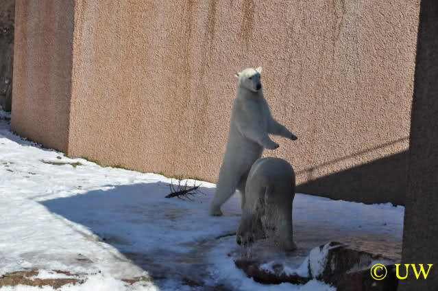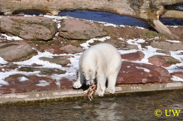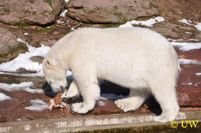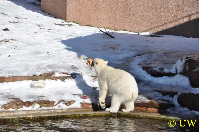 Die Hühner wurden mit großer Begeisterung entgegengenommen; die Tierpfleger lassen sich auch bei den Fütterungen viel einfallen, um die Eisbären zu beschäftigen. Die Hühner mussten von den beiden (auch von Vera, auch die hat eines bekommen) erst einmal gerupft werden. Es kam die Frage auf, ob die Federn mitgefressen werden, allerdings waren die später noch da.
