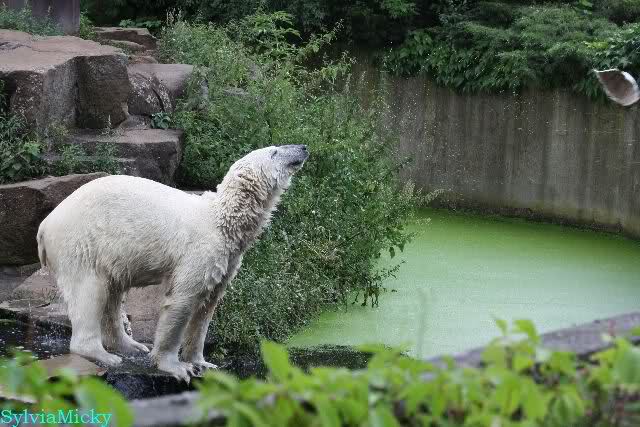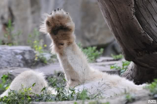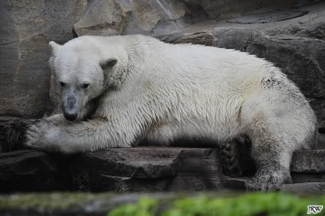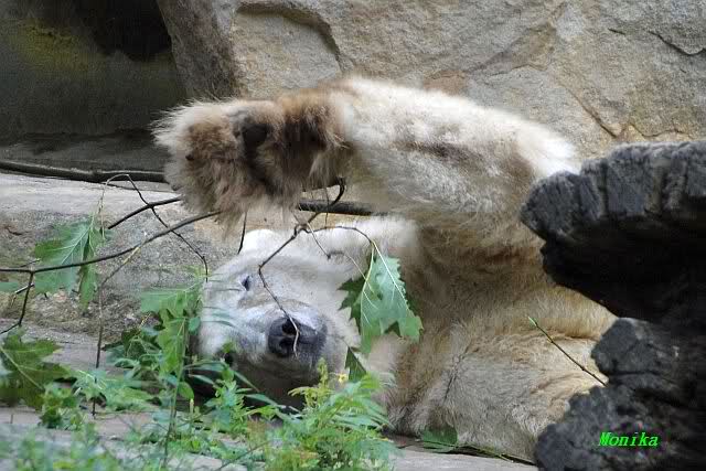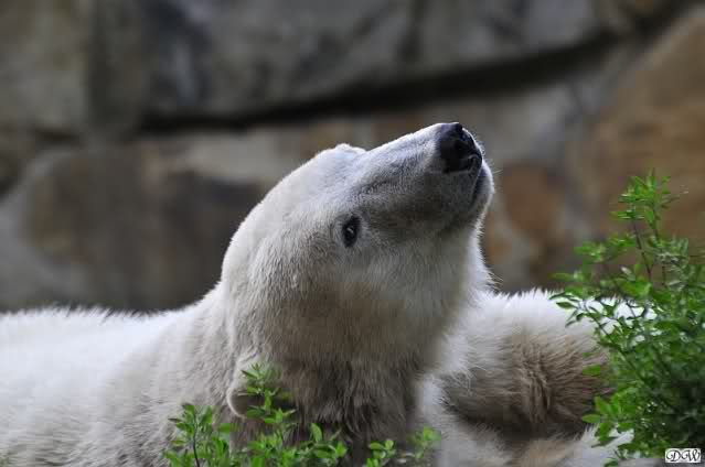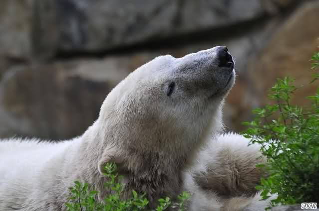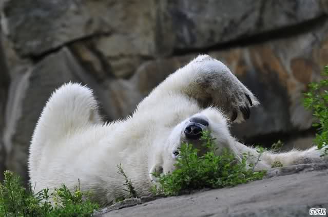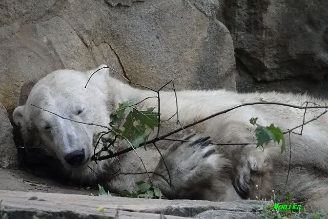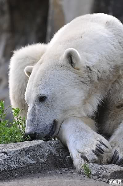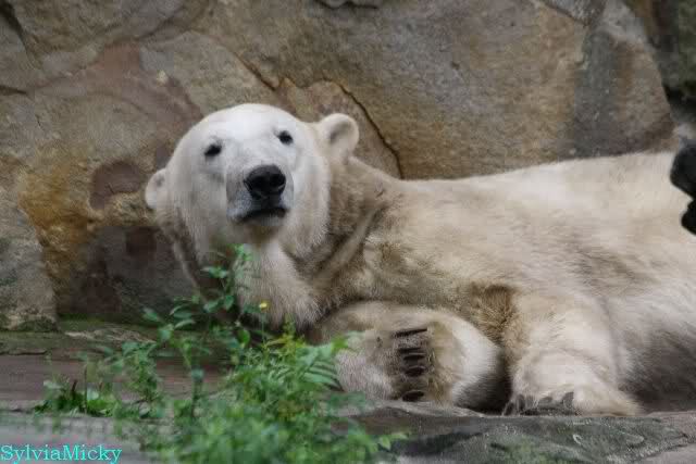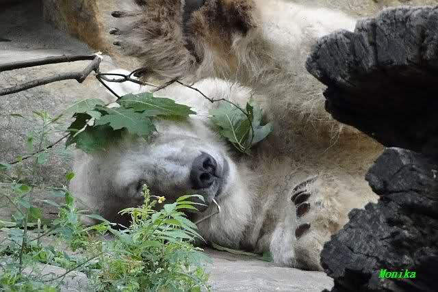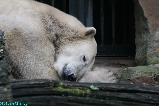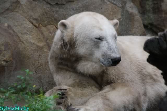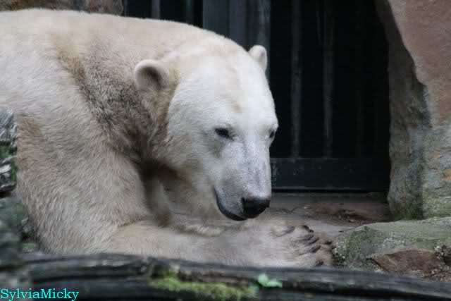 Am Vormittag döste Knut. Ab und zu hob er den Kopf und betrachtete die Zuschauer. Ganz kurz ging er über die Anlage suchte ein Pflänzchen um sich dann wieder hinzulegen und weiter zu dösen. Als ich gegen Mittag den Zoo verließ lag er noch an der gleichen Stelle.