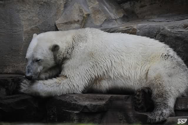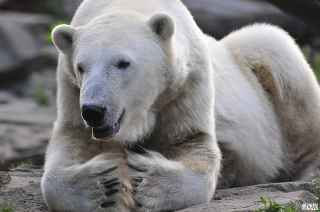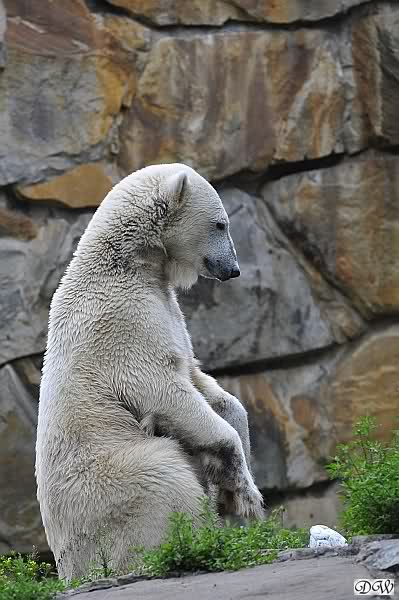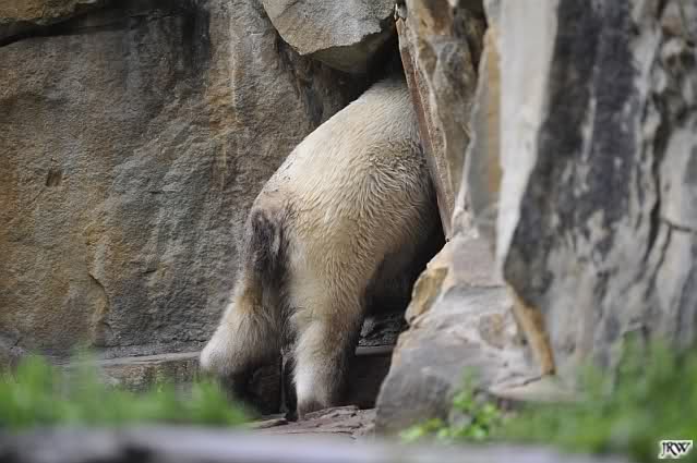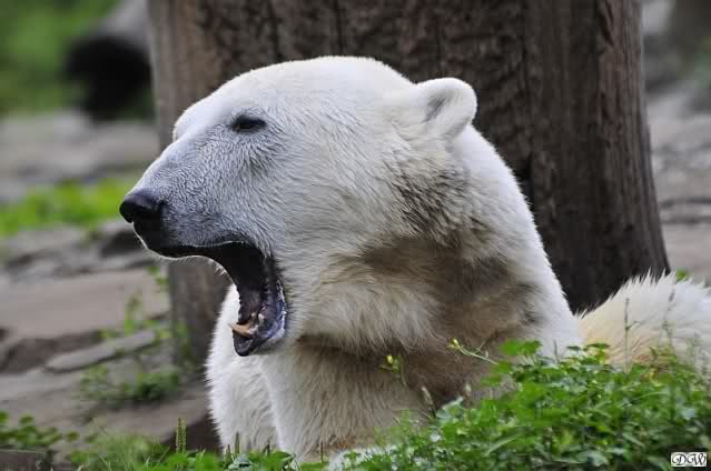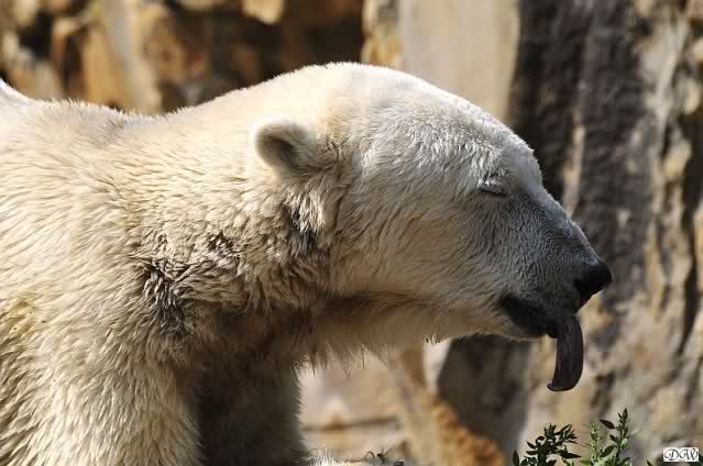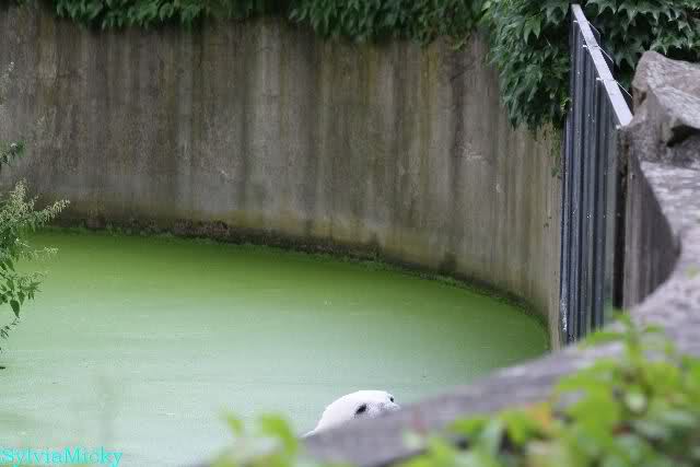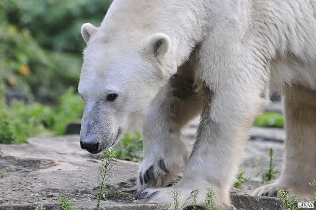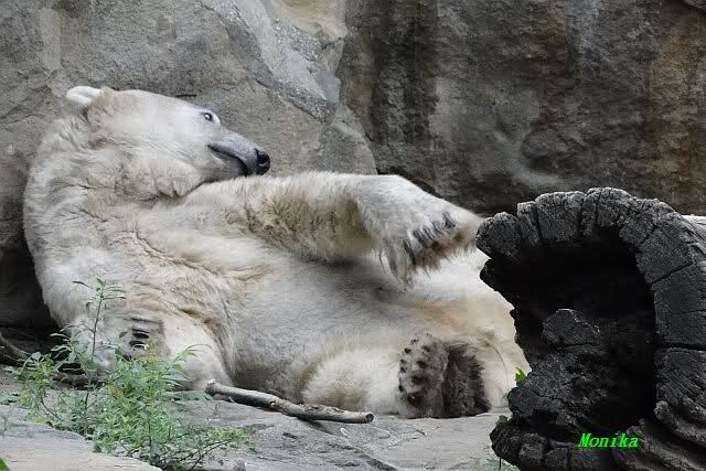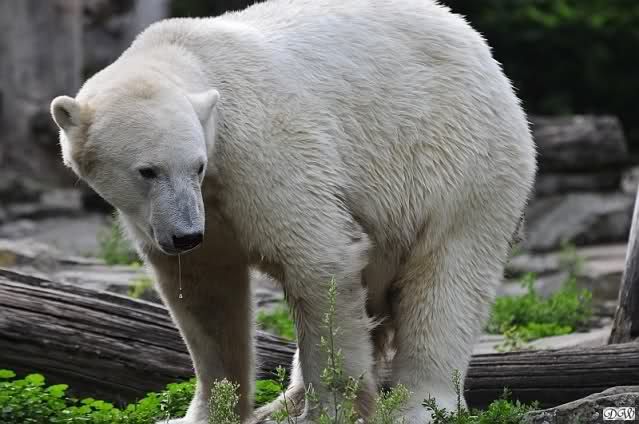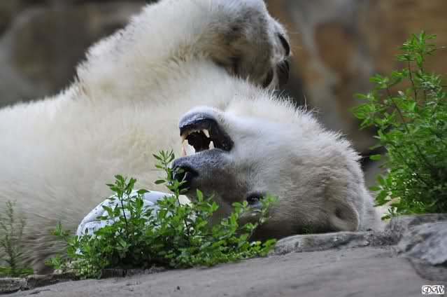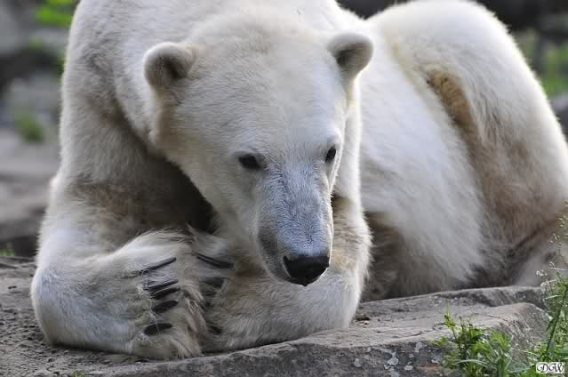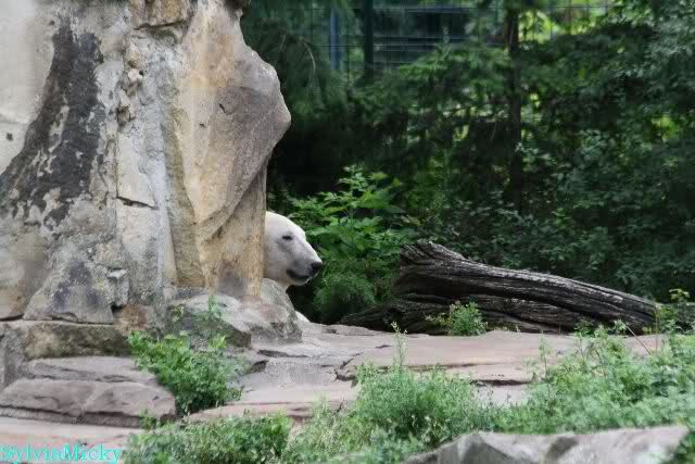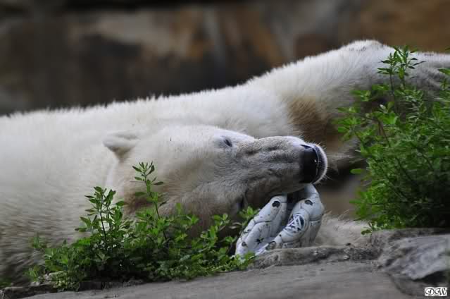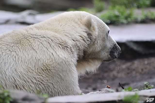 Am Vormittag döste Knut. Ab und zu hob er den Kopf und betrachtete die Zuschauer. Ganz kurz ging er über die Anlage suchte ein Pflänzchen um sich dann wieder hinzulegen und weiter zu dösen. Als ich gegen Mittag den Zoo verließ lag er noch an der gleichen Stelle.