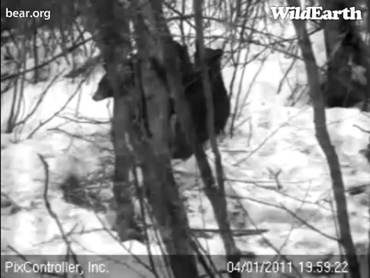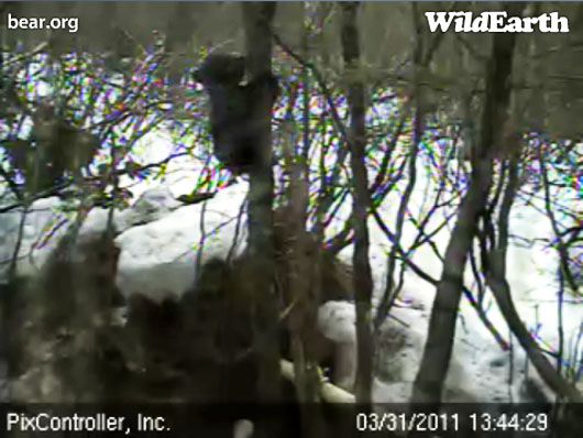 Wohin gehen Lily und Hope und was machen sie? Sie scheinen in den tieferen nahen Wäldern, wo der Schnee nicht so hoch ist zu fressen. Wahrscheinlich fressen sie Schneeflöhe und Raupen. Wir beobachteten wie Hope an einem Holzklotz zog und riss. Raupen sind eines der ersten Frühlingsfutter. Sie müssen hart arbeiten um ein paar kleine Raupen zu ergattern. Sie könnten auch klettern um an Kätzchen oder Knospen zu kommen, doch haben wir nicht den bekannten Ton von ‚Krallen auf Rinde‘ von kletternden Bären gehört. Nur brechende Äste und splitterndes Holz.
