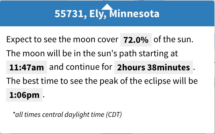 Morgen zwischen 13:07 – 14:26 (cst) oder so werden wir eine teilweise Sonnenfinsternis im Gebiet von Ely sehen. Ich weiß, dass die meisten von Ihnen die genaue Zeit kennen werden und vielleicht wird Dr. Rogers das in der Update von heute Abend einfügen (Zusatz: die untere Graphik dank https://interactives.courier-journal.com/projects/eclipse-2017/. Eine weitere interessante Seite über die Simulation der Verdunkelung http://time.com/4882923/total-solar-eclipse-map-places-view/ auf die Graphik drücken und Postleitzahl eingeben.
