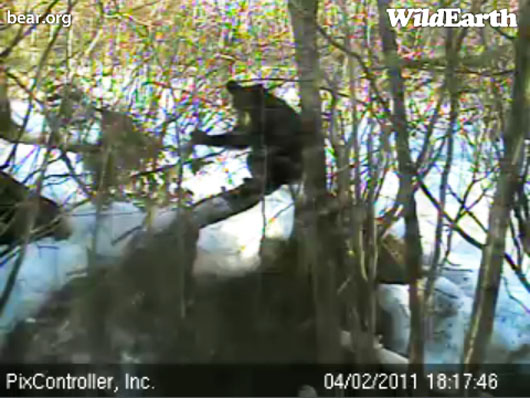 Wir wünschten die PTZ Kamera könnt höher schwenken! Wir hörten den bekannten Klang von „Krallen auf Rinde“ konnten aber die Bären nicht finden. Schließlich entdeckten wir Lily einen Baum herunterkletternd als wir die Kamera schwenkten. Hope war oben im gleichen Baum und kam später herunter. Lily hat auch die Höhlengegend besucht, doch eilte zurück als ein Kleines schrie. Wir schwenkten herum und bekamen einen guten Blick auf ein Junges – wahrscheinlich Faith.