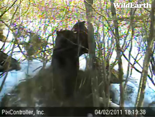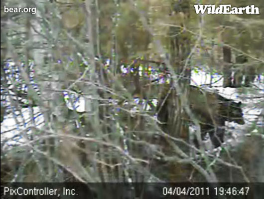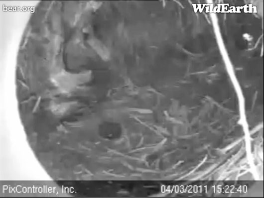 Der Boden der Höhle sieht dunkler aus, was, wie wir denken, Feuchtigkeit ist. Inzwischen bleibt die Familie an dem Ort entfernt von der Höhle. Es sieht so aus und klingt auch so als ob die Jungen ok wären. Wir wünschten wir könnten jetzt besser sehen. Das bisschen Bewegung das wir durch die Bäume sehen sieht aus wie gewohnt mit Hope wahrscheinlich mit den Pfoten mit den Kleinen spielend. Alles sieht gut aus. Wir werden sehen was sie in den nächsten paar Tagen mit kaltem Nieselwetter bevor es am Donnerstag wieder in die 40-iger gehen wird unternehmen werden. Wir nehmen an, dass Lily und vielleicht auch Hope das tun werden was June mit Bud Cal und Lily während der feuchten Woche als Lily klein war 2007 getan hat. June leckte die ganze Zeit Wassertropfen von ihnen, ganz wie es Blackheart mit Dot und Donna (beide noch am Leben) 2000 in ihrer Höhle gemacht hat und wie es in dem Film „Der Mann der mit den Bären wandert“ dokumentiert ist. Schauen Sie sich das VIDEO von June wie sie sich um ihre nassen Jungen kümmert, an.