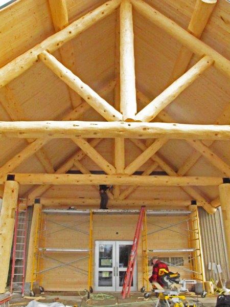 Der Eingangsbereich am Bären Zentrum macht Fortschritte. Wir müssen noch ein paar Monate warten um die Baumstämme zu lackieren und ihnen ihren endgültigen Glanz zu geben, doch es sieht schon sehr gut aus mit der Wand von Holz gegen das Gebäude. Sie werden es fertigstellen mit Baumstämmen, die die Türen umgeben, einschließlich Beleuchtung die auf die oberen Baumstämme gerichtet ist und schöne Nut- und Federbretter, die auf der Unterseite des Daches sein werden.