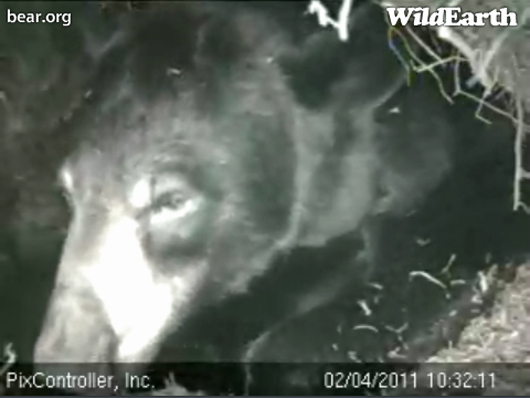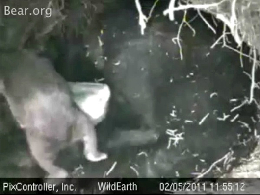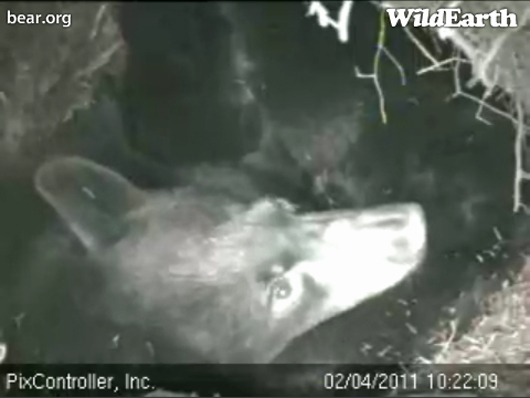 Eine weitere Geschichte die uns gefällt ist, wie Lucky mit Ted in ihrer Höhle kuschelt (Höhlenkamera unter http://www.bear.org/livecams/ted-lucky-cam.html). Wir wissen nicht, was es ausgelöst hat, aber Ted machte eine schnelle Bewegung und gab einen kurzen kehligen Laut von sich als ob erschrak. Lucky sprang hoch und machte ein lautes schrilles Stöhnen aus Angst. Ihre Stimmen schallten laut in ihrer Zementhöhle. Dann sind beide zur Ruhe gekommen, nervös leckend. Lucky legte sich vorsichtig wieder in seine Kuschelposition mit seinem Kopf auf Teds Hals und Kinn. Ein Video von diesem Zusammenspiel kann man hier sehen: http://www.youtube.com/watch?v=5drHPKBvhPk (der Ton wurde leiser gemacht um ihre Lautsprecher zu schonen!) Das ist keine Position die Ted lange Zeit tolerieren würde, denn dadurch bleibt seine Schnauze in der Kälte. Jetzt schlafen sie wieder getrennt.