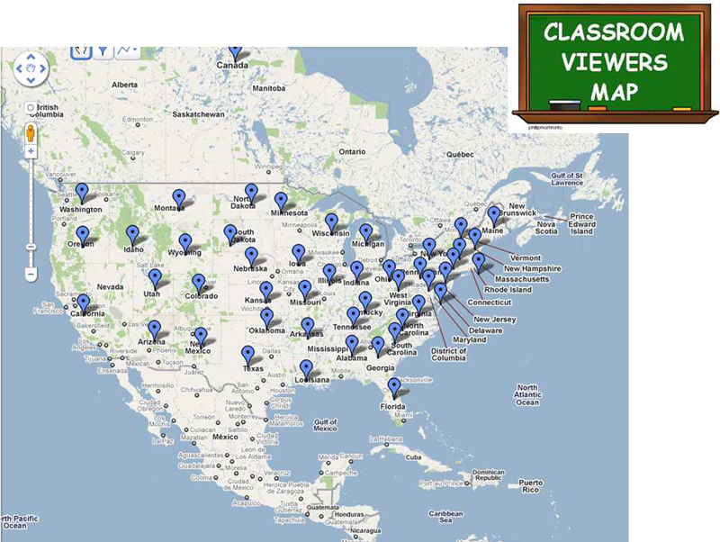 Das Bild ist durch Bildung für Öffentlichkeit wo Rhonda Hennis ihren Schülern getrocknete Exkremente eines Bären zeigt. Rhonda macht den Pilottest mit einer der Schwarzbärboxen und erweckt Interesse an Bären. Sie ist in Nord Carolina. Die Karte zeigt wo Lehrer die Höhlenkamera von Lily im Unterricht benutzen. Zwischenzeitlich haben sie wie verrückt abgestimmt um Ely zu einer neuen Heizung für die Schule zu verhelfen.