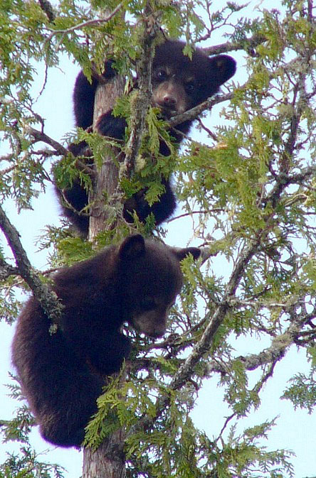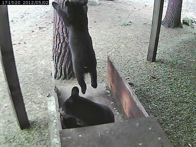 Eine der Datenerfassungen heute was der Eintrag der Bärengewichte von der Waage in eine Tabellenkalkulation und den Bären von den aufgenommenen Bildern zu identifizieren. Sue bezeichnet das als „Wunder Waage“, denn dort werden das Gewicht und ein Bild aufgenommen und auf dem Computer im Büro gespeichert. Wir haben nur sicherzustellen, dass die Waage mit Nahrungsmitteln bestückt ist und das Computerprogramm arbeitet. Jedoch ist der Übertrag der Daten aus den Dateien in eine Tabelle mühsam. Hin und wieder ruft eines der Bilder ein Lächeln hervor und erleichtert die Aufgabe. Das Bild des Jährlings, aufgenommen als er von der Waage in die Sicherheit der nahen Weißen Kiefer springt, ist eines davon!