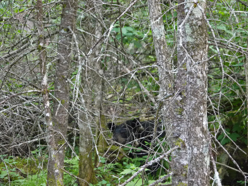 Wir sahen nichts Falsches. Sie fraßen Blaubeeren. Die ersten, die in diesem Waldgebiet reiften waren auf der sonnigen Nordseite der Straße und dort waren sie. Jewel ignorierte die Autos. Die Menschen konnten das Verhalten einer ungestörten Bärenfamilie auf Nahrungssuche beobachten. Wir machten auch Bilder vom Auto aus. Nachdem die Familie sich in den dunklen Wald begeben hatte, gingen wir dorthin wo sie gefressen hatten und machten Bilder von einem Beerenbusch, den sie nicht abgefressen hatten.