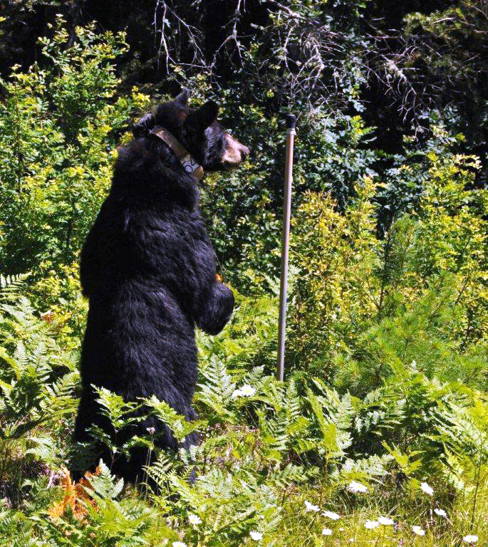 Wir wechselten die Batterien während die Kursteilnehmer das aus der Entfernung beobachteten. Die Routine ist ihr vertraut und sie ist der Bär, dem die Forscher am meisten gewohnt sind. Sie ignorierte das Zerren um das GPS Gerät aus dem Behälter an ihrem Halsband zu nehmen. Sie kaute während die Batterien gewechselt wurden und das Gerät wieder in den Behälter gegeben wurde. Sie kaute, als wir ihren Herzschlag von 78 pro Minute abhörten und verschwand danach im Wald. Lynn folgte eine kurze Weile um ein Bild zu machen und wurde meist ignoriert. Der Beginn einer Wanderung folgt oft der Verfütterung von einer Handvoll Nüssen.