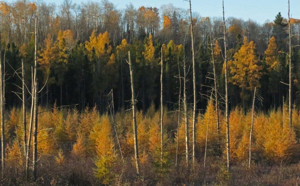 Kurz nach der Morgendämmerung wurde das melodische Krächzen der Raben weit in den ruhigen Morgen getragen und der Sonnenaufgang ließ die Espenblätter besonders golden aussehen. Espen und Ahornblätter leuchteten mehr als die Tamaracks, aber alle waren wunderschön. Das Fallen der Blätter wird bei den meisten Arten in einigen Wochen vorbei sein und kurz danach die Tamaracks.