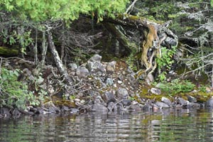 Während Lily und Hope in der Höhle waren, zeigten wir nie, wie nahe am Seeufer sie war. Die Felsbrocken im Bild wurden aus der Höhle herausgeworfen. Der neue Besitzer des Grundes erlaubt keine Besuche auf dem Land, er fürchtet Haftungsfragen, aber wir können mit dem Boot ans Ufer fahren, damit Besucher auf dem Bogen stehen und in die Höhle schauen können. So nah ist sie am Ufer.
