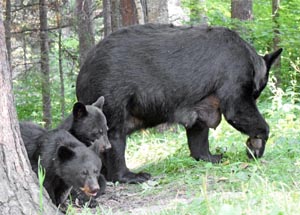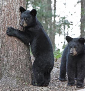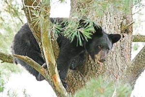 Schwarzbären werden oft als das nordamerikanische Gegenstück zu den Menschenaffen bezeichnet. Wie die Menschenaffen sind die Schwarzbären Allesfresser, haben eine Menschenartige Gestalt und klettern auf Bäume. Eine Frage ist, ob Schwarzbären Schlafnester in Bäumen bauen, wie die Menschenaffen das machen. Gestern beobachteten und hörten Mike und Lorie einen männlichen Schwarzbär Jährling hoch oben in einer Weymouthskiefer, wie er Zweige zusammen in ein Nest zog und sie abbrach wie er es brauchte. Im Gegensatz zu anderen Bärennestern, die wir gesehen haben (mit einer Ausnahme), hat das nichts mit Sammeln von Nahrung zu tun. Solche Nester findet man am häufigsten in Frucht- oder Nussbäumen wo Bären sitzen und die Äste zusammenziehen um an die Nahrung zu kommen. Sie können sie dort halten indem sie auf den Ästen sitzen und schließlich ein Nickerchen machen auf der Plattform die sie gebaut haben. Aber Weymouthskiefern tragen keine Nahrung. Vor einigen Jahren haben ein Mitwissenschaftler und ich angefangen über Bärennester zu schreiben, aber wir legten das Manuskript beiseite wegen meiner Zweifel daran. Diese Beobachtung gießt jetzt wieder Öl aufs Feuer.