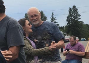 Unser gemeinsamer Abend war lustig und aufmunternd. Donna und ich gingen zu einem Konzert im Freien von Pat und Donna Surface in Winton, MN (nahe Ely). Pat und Donna sind liebe Freunde. Donna hat vorher angerufen und erzählt, dass sie eine Vorstellung geben. Das ist immer viel Spaß und gute Musik. Meine Lieblingssänger sind Pat Surface und Elvis. Pat macht die Musik, die wir als Hintergrundmusik gerne hören. Wenn wir während der Kurse seine Musik spielen, dann kaufen die Teilnehmer sich diese. Das gleiche gilt für das Bären Zentrum. Pat und Donna (Spiritwoodmusic.com) sind große Unterstützer des Bären Zentrums und der Bären. Sie sind Lily Fans, deren Leben durch die Bären verändert wurde. Donna Surface sah wie wir spät dazukamen. Wir wurden von verschiedenen Menschen mit Umarmung begrüßt, darunter einem DNR Mitarbeiter, der die Wahrheit kennt. Donna Surface gab bekannt, dass wir uns unter das Publikum gemischt haben und erwähnte, unter dem Applaus des Publikums, „wie viel (wir) für Ely und das Bären Zentrum tun“. Als sie Pause machten, rief sie einen Kellner damit sie und Pat jedem einen Drink kaufen konnten. Pat fing an meine Sprache nachzumachen mit Redewendungen, die ich benütze. Die Leute lachten und klatschten und drehten sich zu uns um wie gut er war. Dann sang er eines der Lieder das er über Bären und mich geschrieben hatte. Das war Makwa Manido (Geister Bär), das in einigen ihrer Alben vorkommt. Ein anderes ist Bearwalker: One Step at a time. Das Konzert endete mit einem langsamen Lied und jeder stand auf und tanzte. Sobald die Musik vorbei war, drehte sich das Paar vor uns um, reichte uns die Hand und sagte, dass sie von der Eagles Nest Community waren und sie alle Bärenarbeit, die wir machten unterstützten. Sie sagten, dass sie oft Bären sehen und niemals ein Problem mit ihnen hatten. Sie sagten mir, dass so viele Leute das gleiche empfinden. Wir sprachen darüber was für eine wundervolle Naturliebende Gesellschaft das ist und das die Liebe zur Natur in dieser Gesellschaft auch die Bären einschließt. Danach zeigte mir Pat einen Gebetsschal, den er für eine bevorstehende Aufführung für Judy McClure, die Angestellte des Bären Zentrums, die zur Chemotherapie für eine 4 Grad Krebserkrankung ist. Pat und Donna hatten vor einigen Monaten auch für Judys Spendensammlung in der Ledgerock Gemeinschaftskirche gespielt. Ich erzählte Judy von dem kommenden Gebetsschal Ereignis und sie war überrascht. Pat und Donna sind so.