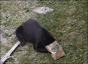 Am Bären Zentrum bekam Lucky einen Leckerbissen in der Tüte eines Supermarkets.