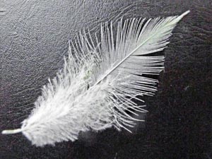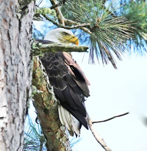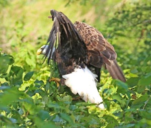 Zurück am WRU entdeckten Andrew und die Gruppe einen Weißkopfseeadler hoch oben in einer Rotkiefer. Er ging langsam darauf zu, machte viele Pausen und veränderte seinen Weg damit nicht der Eindruck entsteht, dass er direkt darauf zugeht. Der Adler blieb. Andrews Geduld hatte sich bewährt. Er hat Aufnahmen gemacht, die wir vorher so noch nicht gesehen hatten. Der Adler flog zu einer nahegelegenen Birke und fing irgendetwas mit dem er auf den Boden flog und in einem Busch verschwand. Über eine Minute lang schien der Adler mit etwas zu kämpfen. Wir wissen nicht, ob der Adler es geschluckt hat, oder ob es ihm entkommen ist. Der Adler flog mit leeren Krallendavon. Andrew und seine Frau und ich suchten den Fleck nach etwas ab um zu sehen, was es war. Nichts. An der Stelle war eine einsame Kopffeder von dem Adler. Wir wussten, dass es vom Adler statt einer Möwe war, da sie war spitz wie auf dem Adlerkopf auf dem alten Bild zu sehen ist. Möwenfedern sind abgerundet wie die andere Feder auf dem Bild zeigt. Der daunige Körper der Adlerfeder war viel deutlicher als das an der Feder der Silbermöwe.
