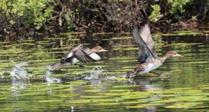 Ein paar junge Kappensäger suchten ihre Flucht im Flug als wir zurück zur Anlegestelle kamen. Andrew hat das beste Bild, das wir jemals von Hochfliegen bekamen, aufgenommen.