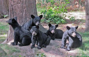 Nach einem Tag am Computer war ich bereit für Abwechslung. Das Telefon klingelte. Es war jemand von einer Fütterungsstation, der Meilen weit weg wohnt und ein wunderschönes Anwesen mit vielen großen Weymouthskiefern hat. Er hat immer geholfen die Spur von vielen von Shadows Nachkommen, die wir nie hier in der Gegend gesehen haben, zu verfolgen. „Annie ist hier“ sagte er drängend. Annie ist kein Clan Bär, aber sie hat fünf Junge, was ich persönlich noch nie vorher erlebt habe. Wir haben ein schönes Foto von New England von einer Mutter mit fünf Jungen und das ist wunderschön, doch wir möchten auch ein Foto von hier in der Gegend aus dem Studiengebiet haben. Ich raste hinüber, aber ein anderer Bär war aufgetaucht und hatte 3 von Annies Jungen in Panik davon getrieben. Alles, was ich bekam, war ein Bildausschnitt von Annie, der interessant ist, da er ihre Brustwarzen, die von vorne nach hinten von klein nach groß gehen. Der vordere Teil um den die Kleinen streiten und die die dominanten Jungen erkämpfen. Wenn es nur zwei Junge sind, nimmt jedes eine Seite, was jedem zwei gibt. Das eine oder andere Junge werden die auf der hinteren Seite leer machen. Mit fünf Jungen weiß ich nicht, wie die das untereinander aufteilen, aber wahrscheinlich würden sie das klären, solange sie noch in der Höhle sind. Wie normal, gibt es Größenunterschiede bei Annies Jungen, wie man auf dem Bild, dass der Grundbesitzer schickte, sehen kann, aber wir haben sie bisher noch nicht identifiziert und wir wissen nicht, wer wie viele Brustwarzen belegt. Annie ist kein großes Weibchen, aber offenbar produziert sie genug Milch für ihre Fünf. Sie war 2006 ein Jährling, was sie in diesem Jahr 12 Jahre alt sein lässt. Seit 2008 hat sie alle zwei Jahre Junge gehabt, außer letztes Jahr, als sie ohne Junge auftauchte. In dem Gebiet war ein großer Waldbrand was uns die Frage stellen lässt, ob irgendwas mit ihnen passiert sein könnte.