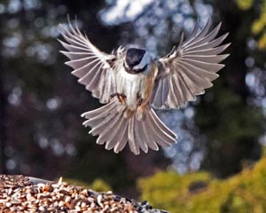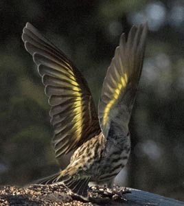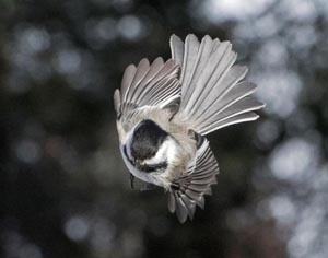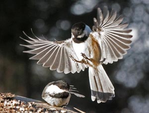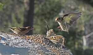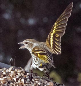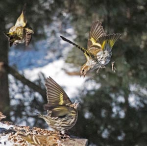 Vor dem Fenster war es offensichtlich, dass Meisen nicht zu den Sonnenblumenkernehaufen fliegen würden, die die Fichtenzeisige mit Beschlag belegten. In der Lage zu sein, über Nahrung als Schar zu dominieren, könnte der Grund sein, warum Zeisige im Winter Scharen bilden. Meisen sind eher Einzelgänger. Sie tun sich wohl an Vogelfutterhäuschen zusammen, aber sie verhalten sich als Einzelgänger. Dann sahen wir, warum die Meisen so zögerlich waren. Die Zeisige sind couragiert. Wenn dort nur ein oder zwei Zeisige sind, werden Meisen versuchen einen Kern zu ergatter und fliegen weg um ihn zu fressen. Doch eine Schar sind mehr, als sie es mit zu tun haben möchten. Wenn eine Meise sich dazugesellen möchte, öffnen die Zeisige ihre langen Flügel und öffnen ihren länglichen Schnabel, um zu sagen „Nein!“ Manchmal machen sie das auch gegenseitig. Die Bilder erzählen die Geschichte. Eines der Bilder zeigt eine Meise die auf einer Stelle landet, wo nur ein Zeisig am Haufen war und ein anderer harmlos vorbeiflog. Ein anderes Bild zeigt eine Meise, die abdreht, offensichtlich beschlossen hat, dass Diskretion der bessere Teil des Mutes ist. Im Hintergrund ist der Zeisig der „Nein“ sagte mit geöffneten Flügeln und einem offenen Schnabel.
