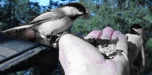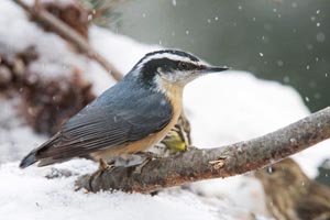 Vor dem Fenster am Wildtier Forschungsinstitut erzeugte der Schnee gestern früh einige wunderschöne Vogelszenen. Heute trieben sich 26 Rote Eichhörnchen dort herum und so mussten sich die Meisen, Fichtenzeisige und Kanadakleiber selber durch den Samenhaufen kämpfen. Zwei Zeisige fraßen friedlich Sonnenblumenkerne, als ein Gespenst oder Engel von oben auftauchte und es wagte, sich unter die nur zwei Zeisige zu mischen, was einen Zeisig dazu verleitet die Flügel auszubreiten um „Nein“ zu einer Meise zu sagen die schnell ihre Meinung änderte und hinuntertauchte. Man kann die Spitze ihres Schwanzes in der unteren linken Ecke verschwinden sehen, während dir Zeisig immer noch einen Flügel ausgebreitet hat. Er zeigt uns wie sein Flügel ausschaut, wenn er im Ruhezustand gefaltet ist und wie er seinen Flügel ausdehnt, was ein wahres Farbenspiel in der Nachmittagssonne ist. Frau Baummarder tauchte für ihre Tagesration Dattelmash auf. Unmittelbar bevor sie wegging öffnete sie ihr Maul um zu zeigen, dass das Mash nicht an ihrem Gaumen klebte. Eine andere Meise fand einen Haufen ganz für sich alleine und stürzte sich hinein und zog die Bremsen mit ausgebreiteten Flügeln.