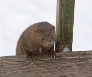 Der Nerz und Fr. Baummarder haben neue Konkurrenten. Ein Graufuchs fand gestern seinen Weg zum zweiten Stock. Heute entdeckte ich, dass das Dattelmash verschwunden ist und der Speck und Rindertalg nicht an ihrem üblichen Platz waren. Nerz und Baummarder schienen durcheinander. Dann entdeckte Fr. Baummarder ein Rotes Eichhörnchen von einem Zweig unter der Balsamfichte aus und machte einen Sprung, hatte aber keine Chance gegen das bewegliche Eichhörnchen, das fünf Fuß zu einem Punkt auf seinem Weg zum Baum sprang. Vor einigen Tagen blieb ein Eichhörnchen in aller Ruhe auf einer Seite des Baumes sitzen, während Fr. Baummarder auf ihrem Weg nach unten pausierte. Das alles geschah zu schnell um ein Bild zu machen. Heute ging sie auf demselben Weg. Kurz erschien Herr Nerz und verschwand wieder. Ich war auf dem Weg aus der Tür um das Geheimnis zu lüften, als er unter dem Deck hervorkam. Er blieb für ein Bild ruhig und rannte dann an mir vorbei die Treppen hinunter. Nachdem die Carnivorengefahr vorbei war, stellten sich die Eichhörnchen in einer Reihe auf an die Sonnenblumenkerne Haufen.