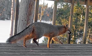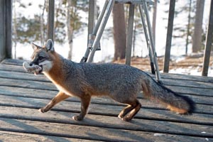 Vor dem Fenster ist der neueste wunderschöne Futter-Anwärter auf den zweiten Stock. Der Graufuchs hatte heute Nachmittag seinen ersten Auftritt bei Tageslicht und war so freundlich für vier Zugaben zurückzukehren. Er machte fünf Besuche um das Fressen zu ergattern, das Donna für Herrn Nerz, Fr. Baummarder und Graufuchs aufgehoben hatten, es war Hühnchen darin. Unsere Freunde, die eine halbe Meile weit weg wohnen, haben neun Graufüchse, die im Wettbewerb um Hühnerflügel stehen, die sie im Angebot kaufen. Heute Nachmittag war der Fuchs direkt vor meinem Fenster (Foto) und verschwand mit einem Stück Fleisch. Ich dachte, dass es das gewesen sei, aber er kam bald wieder. Nach vier kurzen Besuchen wusste ich schließlich was zu tun. Sich an der Glastür auf den Boden legen und bereit sein. Ich musste nicht mehr , als meinen Auslösefinger bewegen, als er die letzten Male vorbeikam und ging, mich niemals anschauend. Das letzte Stück Fleisch (Foto) muss ihn satt gemacht haben. Die Show war vorbei. Zurück an den PC: