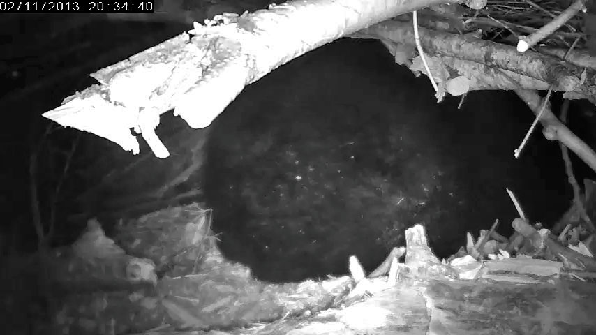 Die Kamera war so lange Online, dass es uns gelang Bilder vom Bildschirm und einige Sekunden Video zu machen. Der Blick in die Höhle hat sich wesentlich verbessert! Es sieht so aus, als wäre Lily an ihrem Weg zurück gegen das Rohr gestoßen, aber wenn es auch so ist, ist es besser als die Mauer aus Holzschnitzeln die wir während des letzten Monats angeschaut haben. Hier ist das kurze VIDEO.