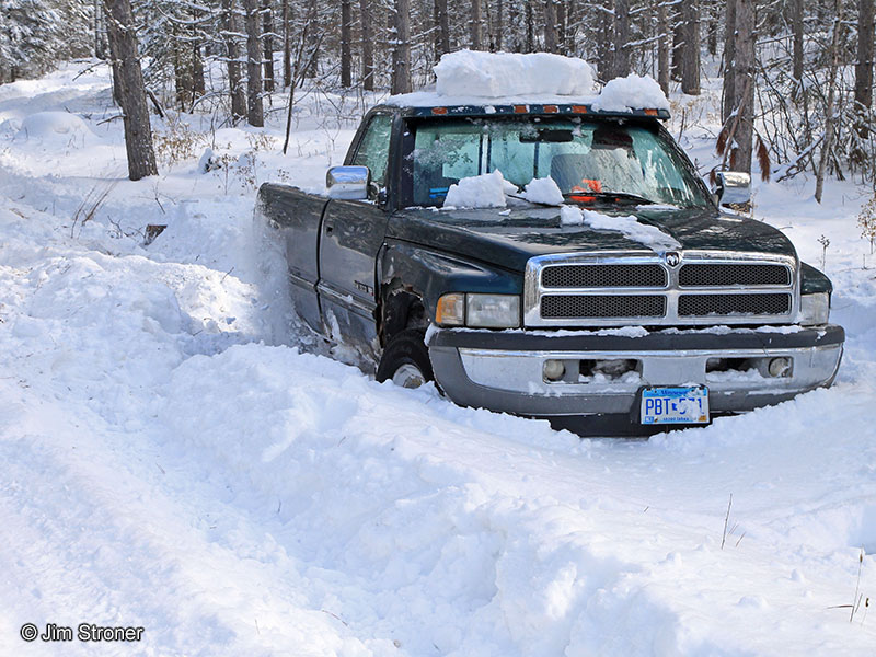 Auf dem Rückweg vom Höhlen-Schuppen rutschte der 4-Rad angetriebene Pickup völlig von der Straße ab. Wir wissen, dass wir ihn bis an die Grenzen ausgefahren haben auf einer völlig ungeräumten Straße. Es sah hoffnungslos aus. Wir riefen Sue an uns auf der nächsten geräumten Straße abzuholen und räumten unsere Wertsachen zusammen – mit dem Plan von dort zu laufen und den Pickup bis zum Frühjahr stehen zu lassen. Während wir warteten versuchten wir es mit einer weiteren Runde ihn freizuschaufeln und auf wundersame Weise kam der Pickup auf die Straße zurück. Wir waren so dankbar für dieses Wunder und das mit Lilys Höhlenkamera.