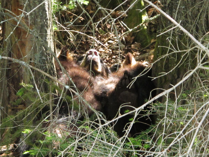 Heute behielten wir die GPS Bären über Computer im Auge und sahen nur einen Bären in natura – Jährling Daisy, Tochter von Bow. Die GPS Bären haben sich an diesem warmen Tag wenig bewegt. Wir fragten uns, ob June mit Big Harry zusammen war, doch war sie zu weit von einer Straße entfernt um zu versuchen sie aufzuholen und sie bewegte sich nicht näher. Wenn sich ein Bär im Wald in die andere Richtung entfernt, ist es fast unmöglich ihn aufzuholen.