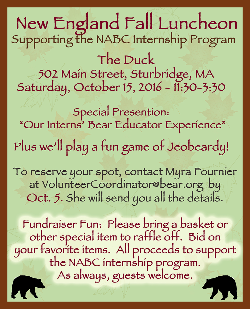 Samstag, den 15. Oktober findet das Sturbridge Mittagessen von 11:30 bis 15:30 Uhr statt. Das ist immer sehr nett, es ist auch immer eine Spendenauktion für das sehr erfolgreiche Praktikanten Programm für das Bären Zentrum – wir planen für 2017 8 Praktikanten.