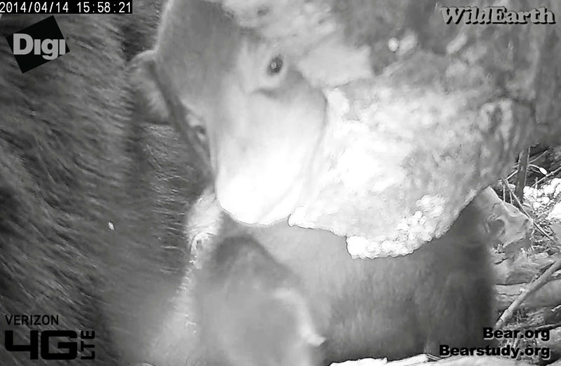 Juliet und die Jungen waren noch heute Morgen in ihrer Höhle, doch könnten sie die jederzeit verlassen. Wir kennen die Schneeverhältnisse in dem offenen Gebiet an dem ihre Höhe ist, nicht. Die Schneeverhältnisse auf den Wegen haben den Zugang verhindert. Der Schnee ist zu tief für einen Pickup und zu matschig für den Motorschlitten. Ein weiteres Problem ist, dass Juliet die Kamera verschoben hat. Wir sehen nur so viel, dass sie noch dort sind. Die Kälte kommt zurück, dann könnten wir mit dem Schneeschlitten dort hinfahren um die Kamera zu richten. Jedes Jahr bringt neue Herausforderungen. Wäre es so einfach, könnte das jeder machen.