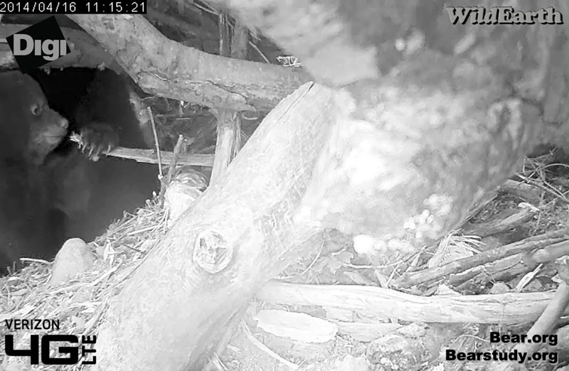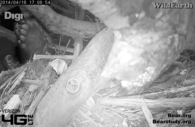 Aster ist seit einigen Tagen aus ihrer Höhle. Sie hat einen gut ausgetretenen Pfad zwischen ihrer Höhle und der Tages-Schlafstelle in 40 Fuß Entfernung gemacht. Vielleicht kehrt sie jeden Abend in ihre Höhle zurück, genau wie Honey am Bären Zentrum das macht. Jedoch wurden keine frischen Spuren zwischen ihrer Höhle und der Tages-Schlafstelle gesehen und sie war sehr lethargisch und langsam in ihren Bewegungen, als die Crew sie fand. Aster geht es gut. Tolle Neuigkeiten nachdem was wir letzten Herbst sahen.