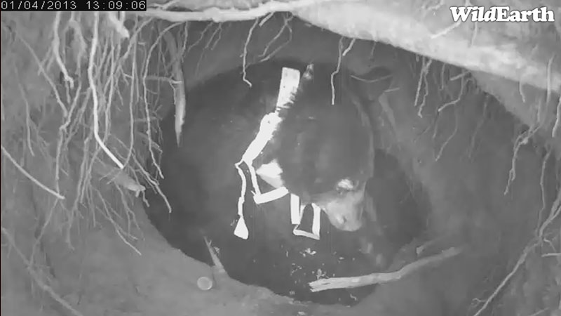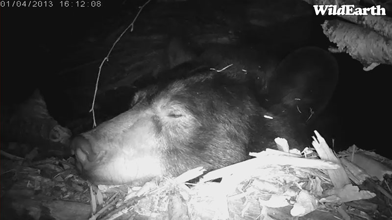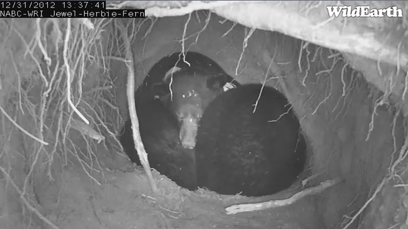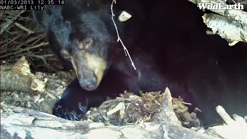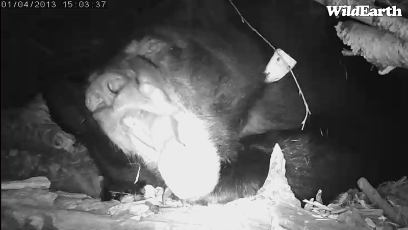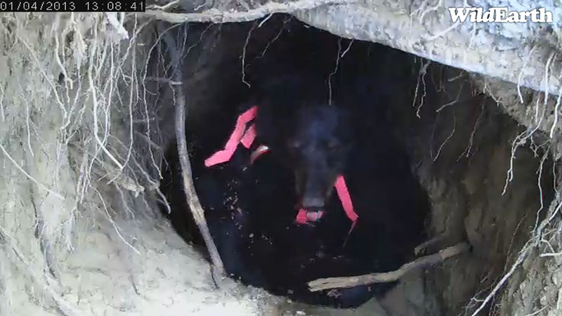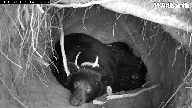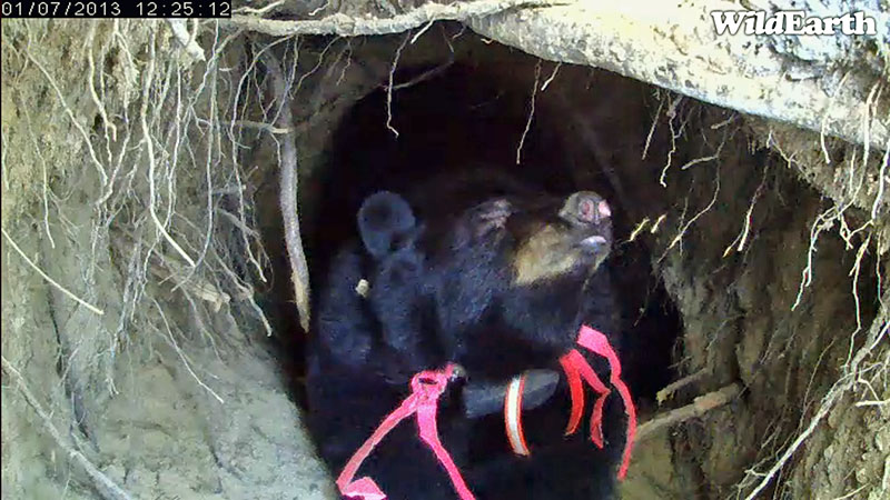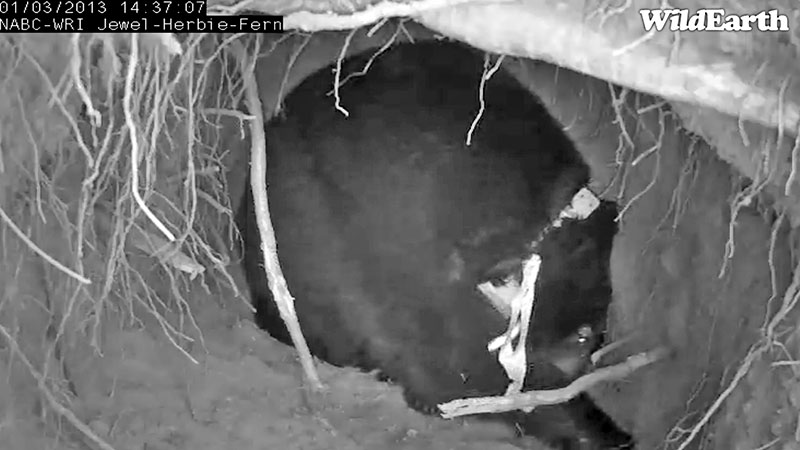 Wir wünschten, wir wären letzten Herbst in der Lage gewesen, Jewels Halsband mit GPS Gerät und Bändern zu entfernen. Sie scheint von den Bändern in der Höhle gestört zu sein. Wir hatten sie ihr zur Jagdsaison angelegt, um ihr Halsband sichtbar zu machen. Als sie letzten Herbst sich in der Höhle niedergelassen hatte, kam sie nicht mehr heraus damit wir es Entfernen konnten. Wir bezweifeln, dass sie vor dem Frühjahr zu uns herauskommen wird. Wir möchten nicht übertreiben und sie mit Futter herauslocken, wenn wir das Muster natürlichen Benehmens, Urinierens und Entleeren beobachten möchten.