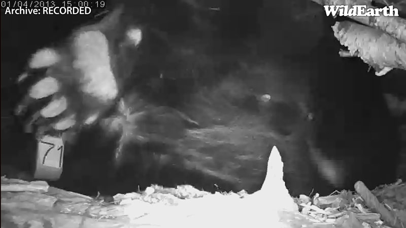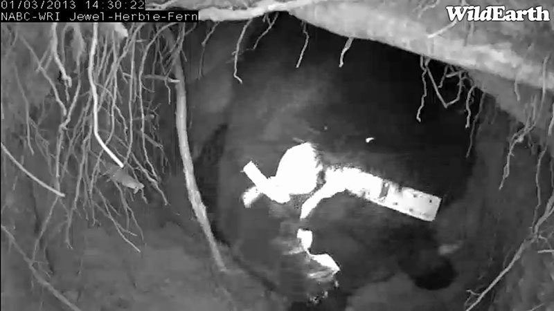 Erinnern Sie sich, dass wir letztes Jahr eine Höhlenkamera in die Höhle der 9-jährigen Juliet installieren wollten, weil sie eine erfahrene Mutter ist? Wir hatten gehofft, ihr Verhalten, in Bezug auf den Umgang mit Jungen, mit dem von Lily vergleichen zu können. Die dreijährige Jewel war unsere zweite Wahl. Wir hielten Abstand davon, eine Höhlenkamera in Jewels Höhle zu installieren, in der Hoffnung die Erlaubnis für eine bei Juliet zu bekommen. Wir haben den Grundstücksbesitzer nicht publik gemacht, denn es war der DNR und wir wollten nicht, dass sie Briefe bekommen. Juliet hatte eine Höhle im Vermillion State Park. Wir wurden von einigen dafür kritisiert, dass wir den Landbesitzer ‚belästigt‘ hätten, doch haben wir nur über die Nutzung von öffentlichen Flächen für unsere Forschung und Bildung verhandelt.