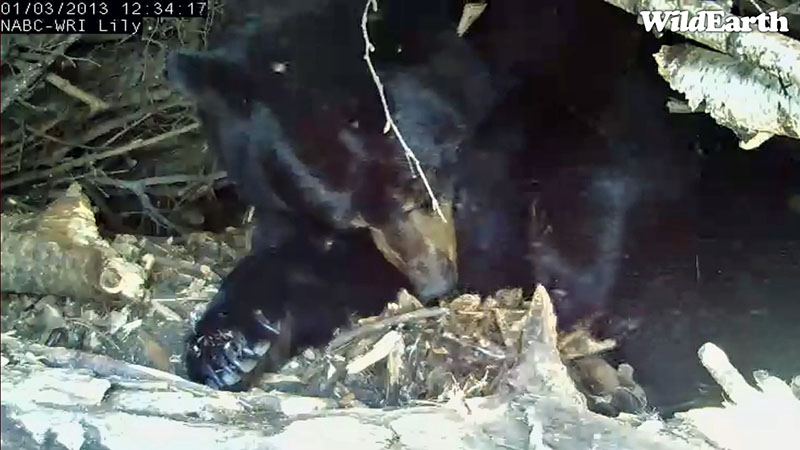 In Lilys Höhle ist das pulsierende statische Geräusch hörbar wenn man den Ton aufdreht, doch der Ton ist klar genug um Lily deutlich schnarchen zu hören! Schnarchen ist nicht so oft zu hören. Das pulsierende statische klingt etwas wie ein säugendes Junges, so müssen die Höhlen-Beobachter ganz genau hinhören, wenn die Jungen geboren sind. Der Ton ist wesentlich besser als das schreckliche Brummen, das die meisten anderen Geräusche im ersten Winter übertönte. Das Techniker Team machte, wie wir finden, eine hervorragende Arbeit. Sie wollten dieselben Geräte installieren die wir im letzten Jahr hatten. Dann, nur einen Monat vorher, entdeckten wir dass 4 G zur Verfügung stand. Sie eilten um die gesamte neue Ausstattung zu kaufen, neue Vereinbarungen mit Verizon zu treffen und herauszufinden, dass es viele kleine Probleme zu beseitigen galt. Sie wurden schneller fertig als jemals zuvor. Gut gemacht, Team!