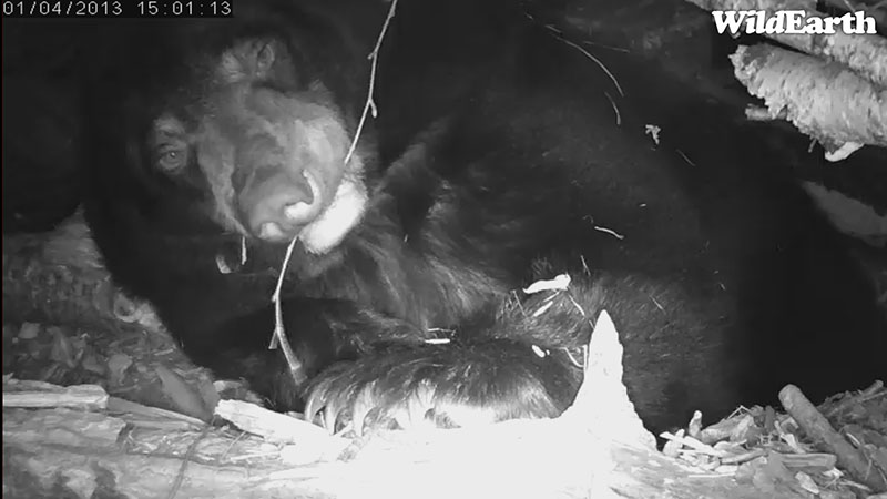 Wir haben vergangenen Herbst nur wenig Gekratztes um Jewels Höhle gesehen, genau wie im Herbst davor. Folglich hat sie sehr wenig ‚Bettzeug‘ in ihrer Höhle, genau wie letzten Winter. Kurz vor der Geburt letztes Jahr, tauchte sie auf und biss Äste von Nadelbäumen ab und nahm sie als zusätzliches ‚Bettzeug‘.