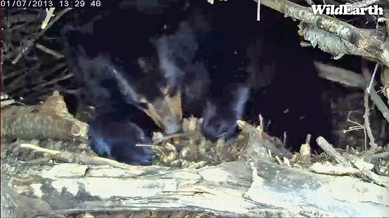 Irgendwie war der Ton, der den Technikern vor Ort gut erschien, für die Höhlenkamera Beobachter nicht laut genug. Das Techniker Team hat Audio hochgedreht und wir können jetzt das Betteln der Jungen nach Saugen, zusammen mit dem Geräusch von Wind und Vögeln hören. Ein VIDEO mit heutigen Bildmaterial.