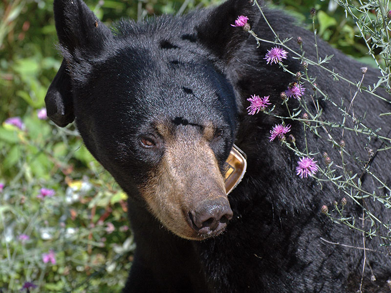 Unsere Lieblingsgeschichte von diesem mächtigen sanften Bären ist, als sechs Teilnehmer eines Schwarzbär Feldkurses ihn hier im Forschungszentrum umkreisten. Das war alles in Ordnung. Shylow hatte gelernt, als seine Mutter Blackheart ihn als Jungen hierher brachte, dass es hier sicher ist. Shylow war der scheueste aus dem Wurf, doch mit ungefähr 2 ½ Jahren bekam er mehr Vertrauen – in Grenzen. An dem Tag, als 6 Leute ihn auf einmal umkreist hatten, war er ein erwachsener Bär, der einige Hundert Pfund wog. Er war immer noch vorsichtig wie immer. Während er ruhig in dem Kries von Leuten saß, erblickte er einen anderen Kursteilnehmen, der sich aus 200 Fuß Entfernung entlang dem Fahrweg der Gruppe näherte. Diese Person war fehl am Platz und erschien Shylow als Gefahr. Er erstarrte, konzentrierte sich auf die Person, drehte sich um und stürzte davon.