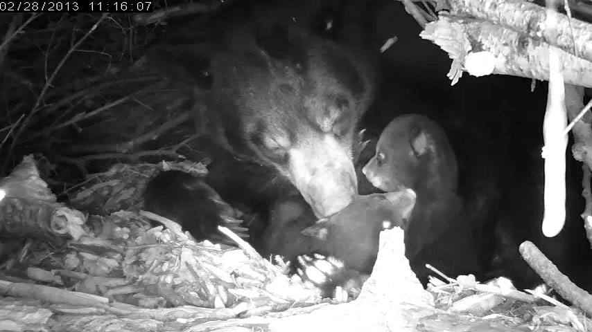 In Lilys Höhle war heute viel los. Sie blockierte die Kamera als sie hinausreichte um Eis und harten knackigen Schnee zu fressen. Dann kratzte sie mehr Holzschnitzel in ihr ‚Bett‘ und kramte in ihrem Bett herum. Ihre Jungen wurden herumgeschupst während sie das ‚Bettzeug‘ zu ihnen und unter sie schob während sie still zusahen. Lily grub wiederholt Holzschnitzel aus einem Loch sehr nahe an ihrem Bett. Das männliche Junge jonglierte unsicher auf der Kante des Loches und rutschte schließlich teilweise hinein. Lily zog ihn, mit Hilfe von Maul und Pfoten, zurück in das Bett. Kurz darauf saugten beide Jungen zufrieden.