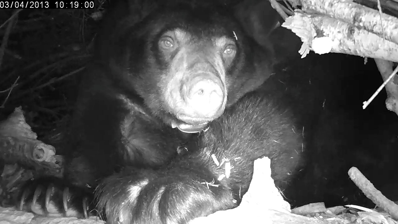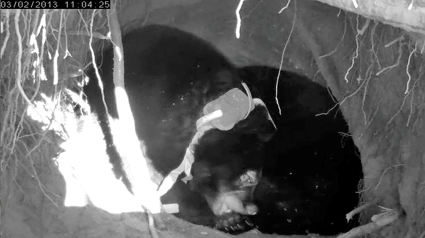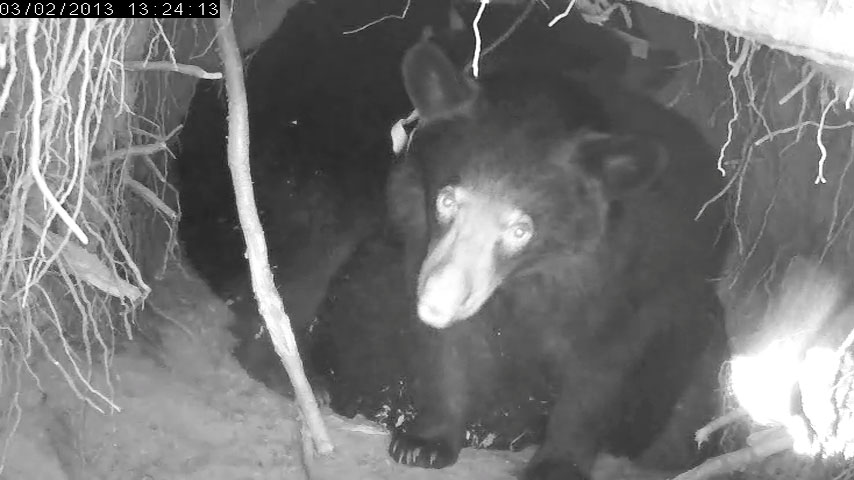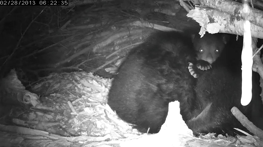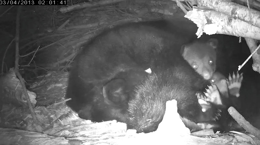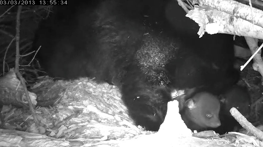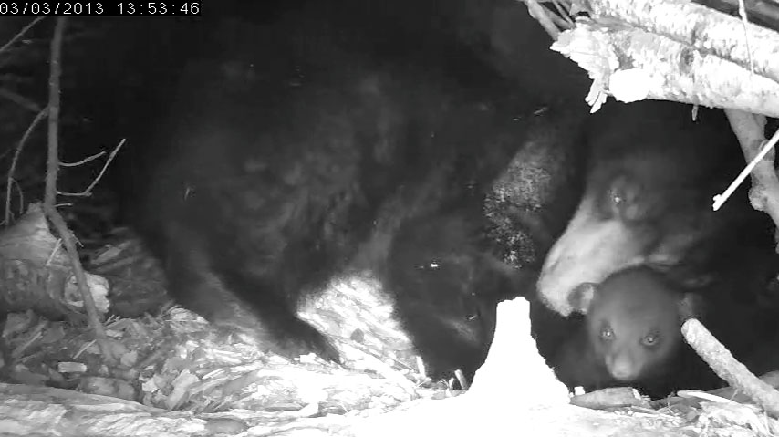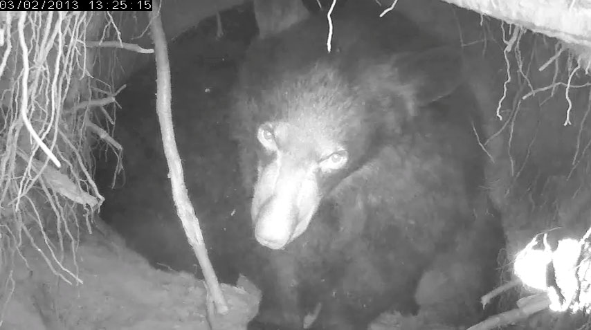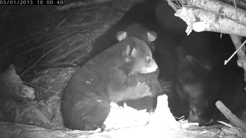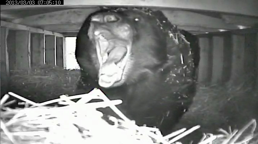 Wir hatten Glück und bekamen einige tolle Aufnahmen an diesem Tag mit June. Allerdings versorgt uns Lilys Höhlenkamera mit einer breiteren Palette von Verhaltensweisen die wir mit den Besuchern im Bärenzentrum teilen konnten. Lilys hochauflösende Höhlenkamera Bilder sind schwarz/weit, aber das macht nichts – das wichtigste sind die Verhaltensweisen die dokumentiert werden. Wir hoffen sehr, dass wir weiter mit 720P übertragen können.