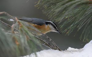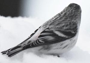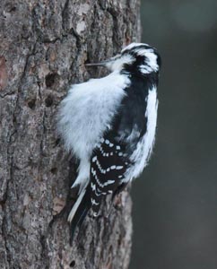 Vor dem Fenster hat es ein Polarbirkenzeisig bis hierher an die südliche Grenze seines Überwinterungsgebietes geschafft. Polarbirkenzeisige sehen aus wie normale Birkenzeisige, außer dass sie heller in der Farbe sind und nur schwache Streifen auf der Brust haben und einen ungestreiften Rumpffleck. Ein Haarspecht gab eine Baumperspektive auf sein Gesicht.