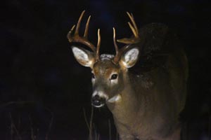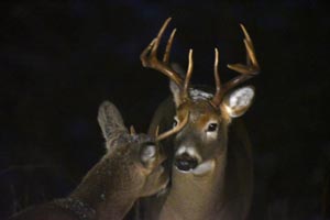Der Bock mit dem gebrochenen Geweih der seinen Kopf senkt und so viele Rehe verscheucht, hat auch einige Freunde. Er ist befreundet mit einem Gabler-Jährling, einer Hirschkuh und dem großen 10-Ender. Als es zu dunkel war, um mit bloßem Auge zu sehen, hat die Kamera es geschafft zu fokussieren und die Situation aufgenommen mit etwas Aufhellung durch Photoshop.. Die Verschlusszeit ist so langsam in diesem Licht, dass jede Bewegung unscharf ist. Der große Bock hat stillgehalten um uns zu zeigen, wer er ist und er hatte einen Moment der Ruhe in seiner Interaktion mit dem Bock mit gebrochenem Geweih was zeigte was sie machten.