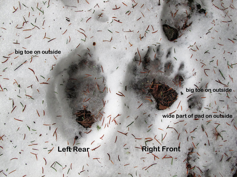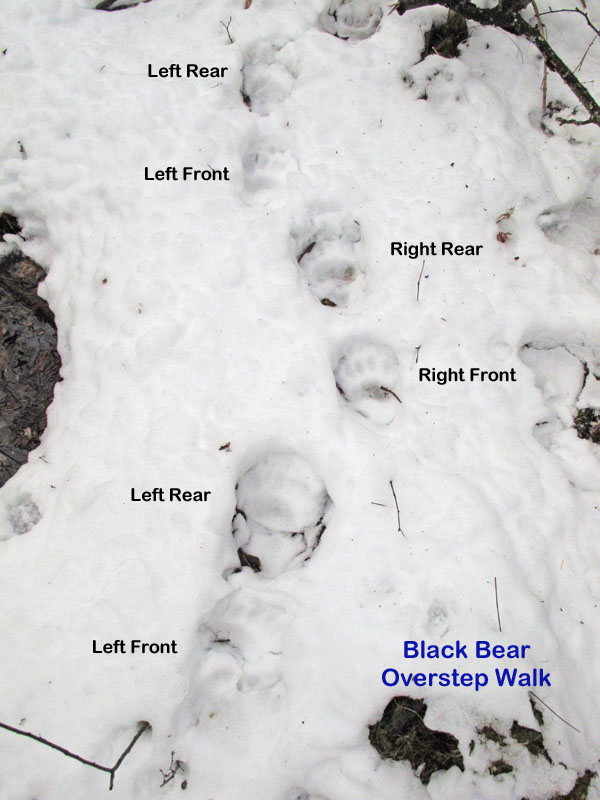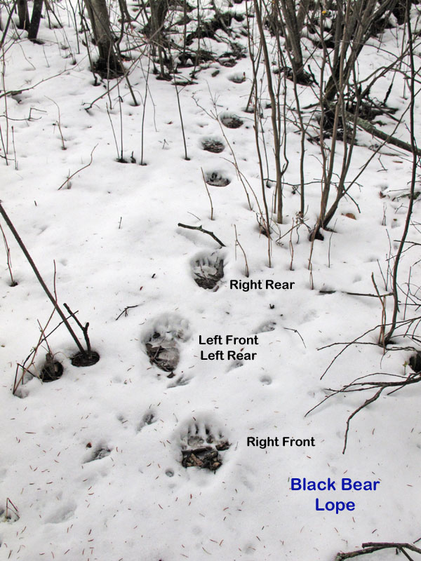 Sue stieß auf eine ‚Spurenfolge‘ und machte ein paar Bilder von den Gangbildern. Schwarzbären laufen normalerweise in einem Übertritt-Muster in dem der hintere Fuß die Spur die der Vorderfuß gemacht hat übertritt (wie im ersten Bild der Gangarten zu sehen). Wenn sie es eiliger haben, gehen sie zum ‚leichten Galopp‘ über wie man auf dem zweiten Bild erkennen kann. Die einzelnen Spuren sind beschriftet um die Spurenfolge zu erkennen.