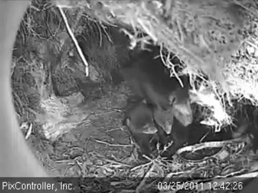 Wir denken, dass, sobald die beiden Kleinen gut genug folgen können werden sie zu höher liegendem Gelände ziehen. Das wird wahrscheinlich in ein paar Tagen so weit sein. Vorher hatten wir geglaubt, dass diese Jungen sich schneller entwickeln als Hope damals. Jetzt fragen wir uns. Wir sind nur 5 Tage von dem Zeitpunkt entfernt als Lily und Hope letztes Jahr einige hundert Yards von ihrer Höhle wegzogen. Wir werden sehen, wie gut sich die Jungen in den nächsten paar Tagen machen.