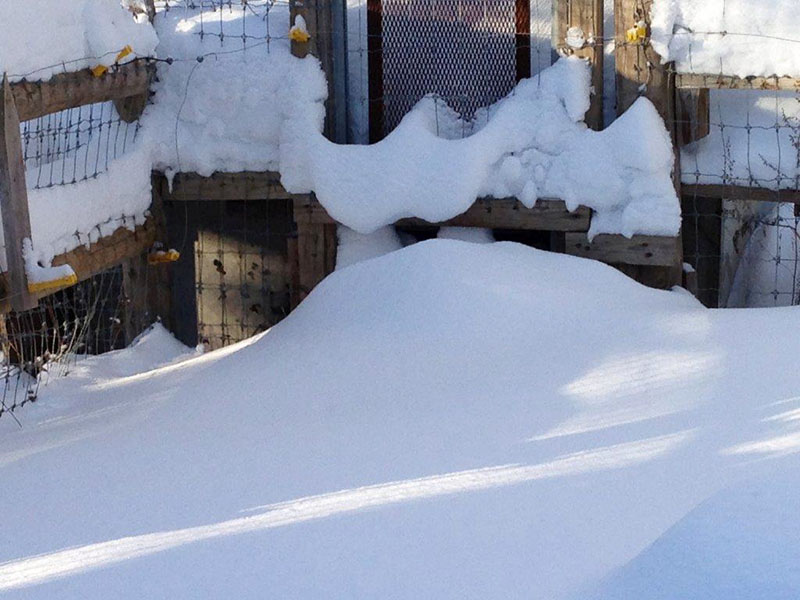 Luckys Höhle zeigt, wie der Schnee sich schön aufgetürmt hat an seiner Tür.