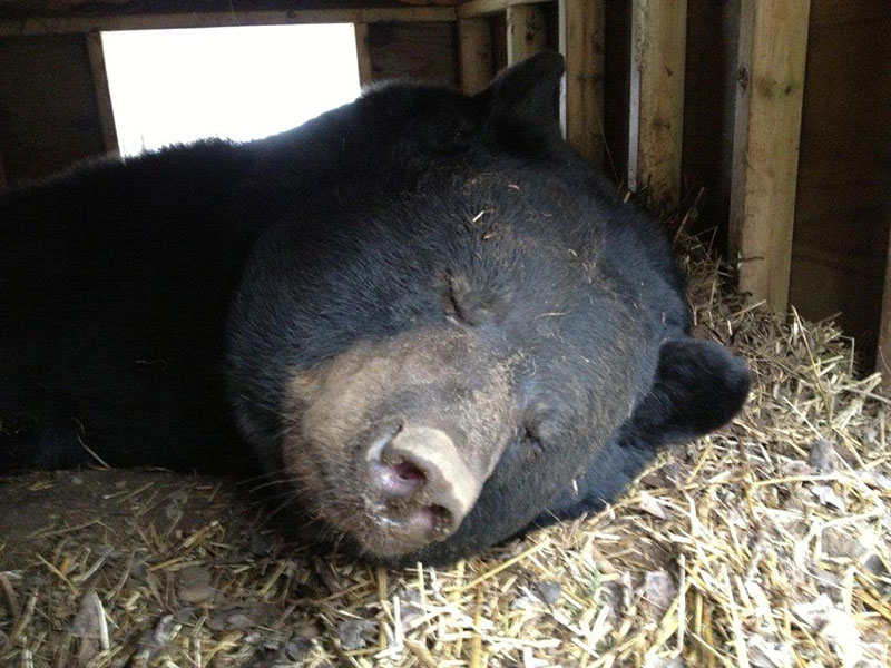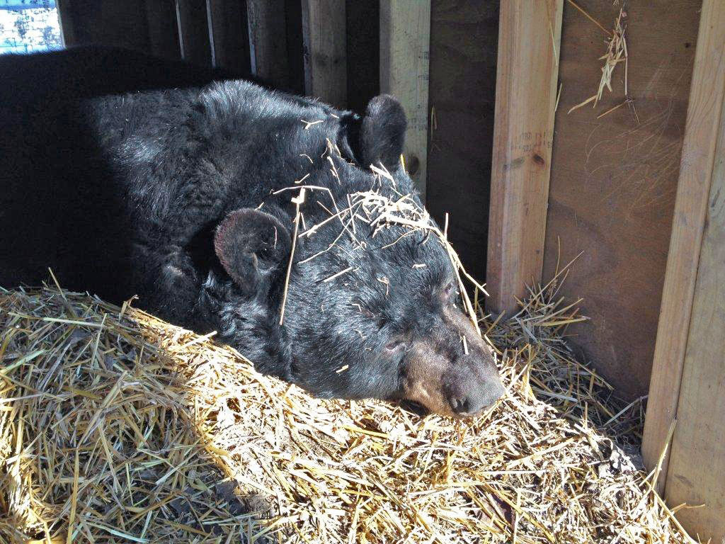 Ted war zu lethargisch um diesen beiden ihm bekannten und vertrauenswürdigen Pflegern Aufmerksamkeit zu schenken. Er sah bequem aus auf seinem neuen Stroh, das er vor zwei Tagen hereingekratzt hatte. In der freien Wildbahnüberwintern einige Bären auf der Oberfläche des Bodens und es geht ihnen gut, aber die meisten Bären finden Höhlen, die zumindest den Wind abhalten.