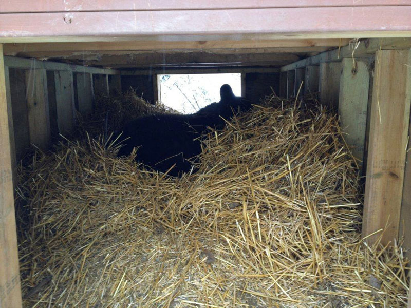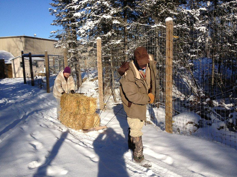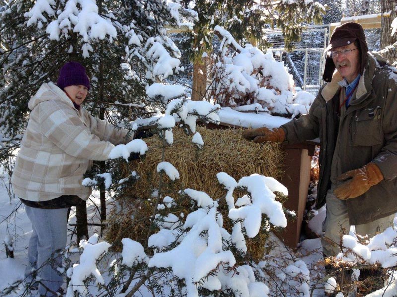 Mit Temperaturen die in Richtung Null Grad Fahrenheit gehen, fragten sich die Mitarbeiter des Bären Zentrums, ob Ted nicht seine Hintertür geschlossen haben möchte damit Wind und Schnee nicht so durchwehen können. Sharon Herrell und John Leonard zogen 2 Ballen Stroh –eine Arbeit die durch das Ziehen eines Schlittens, der von einem Lily Fan gekauft wurde, leichter gemacht wurde. Sie stapelten die Ballen um die hintere Öffnung zu schließen.