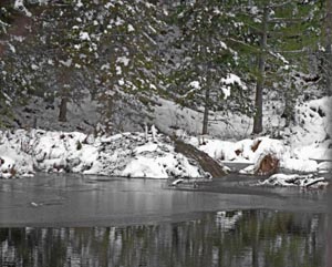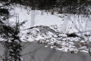 Von der WRI Kabine aus sind zwei Biberbauten zu sehen. Beide zeigen Zeichen von Aktivitäten. Der eine, direkt aus meinem Bürofenster, wurde, so wurde mir gesagt, 1977 gebaut und er wird immer noch benutzt. Auf einer Seite ist, wegen der Biberaktivitäten, kein Schnee. Vorne rechts am Bau sind einige schneebedeckte Äste, die das Winterfutter Vorratslager sind. Dies ist der Bau in dem wir vor Jahren eine Kamera innen angebracht hatten, um die Aktivitäten von Biber, Bisamratten und Nerz beobachten zu können, wie es im der Ökologie Halle des Bären Zentrums zu sehen ist.