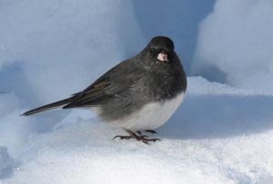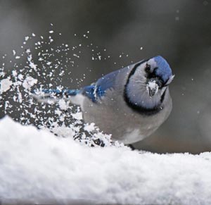 Mehrere Inches Schnee über Nacht bedeckten die Sonnenblumenkerne der Vögel. Meisen und Kleiber können nicht so tief graben. Hungrige Blauhäher kamen zur Rettung. Sie fegten den Schnee mit schnellem, kopfwackelnden Fegen mit ihren Schnäbeln, öffneten Löcher im Schnee, die Meisen und Kleiber zwischen den Besuchen der Blauhäher besuchten. Ein Rotes Eichhörnchen unterbrach den Wettbewerb indem es einen Satz in das Loch eines Blauhähers machte, mit dem Kopf durch den Pulverschnee pflügte, um mit einem Samenkorn wieder aufzutauchen. Ein Blauhäher hatte schlechte Manieren. Nachdem ein anderer fündig geworden war, wurde er überängstlich und schlug mit den Flügeln, strampelte mit den Beinen und erhobener Brust. Der ‚Graber‘ blieb wo er war.