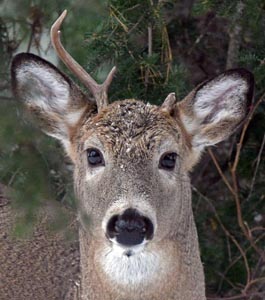Vor dem Fenster denke ich dass der junge Bock mit dem gebrochenen Geweih derselbe ist, der ein junges Reh in die Brust stach. Es ist Paarungszeit. Könnte er mit einem ansehnlicheren Geweih verwickelt gewesen sein?