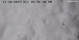 Ein aufmerksamer Lily Mod entdeckte mysteriöses M im Schnee am Bären Zentrum und nahm ein Bild von der PTZ Kamera auf. Die Fußabdrücke sind von roten Eichhörnchen, aber die Linien sind mysteriös. Sie haben die richtige Größe für eine Maus, die sich durch den Pulverschnee pflügt. Machte die Maus ein M als Hinweis? Ich hätte gedacht es sei eine Wühlmaus, aber es ist ein M für Maus. Ich bleibe dabei. Ein Mysterium der Natur.